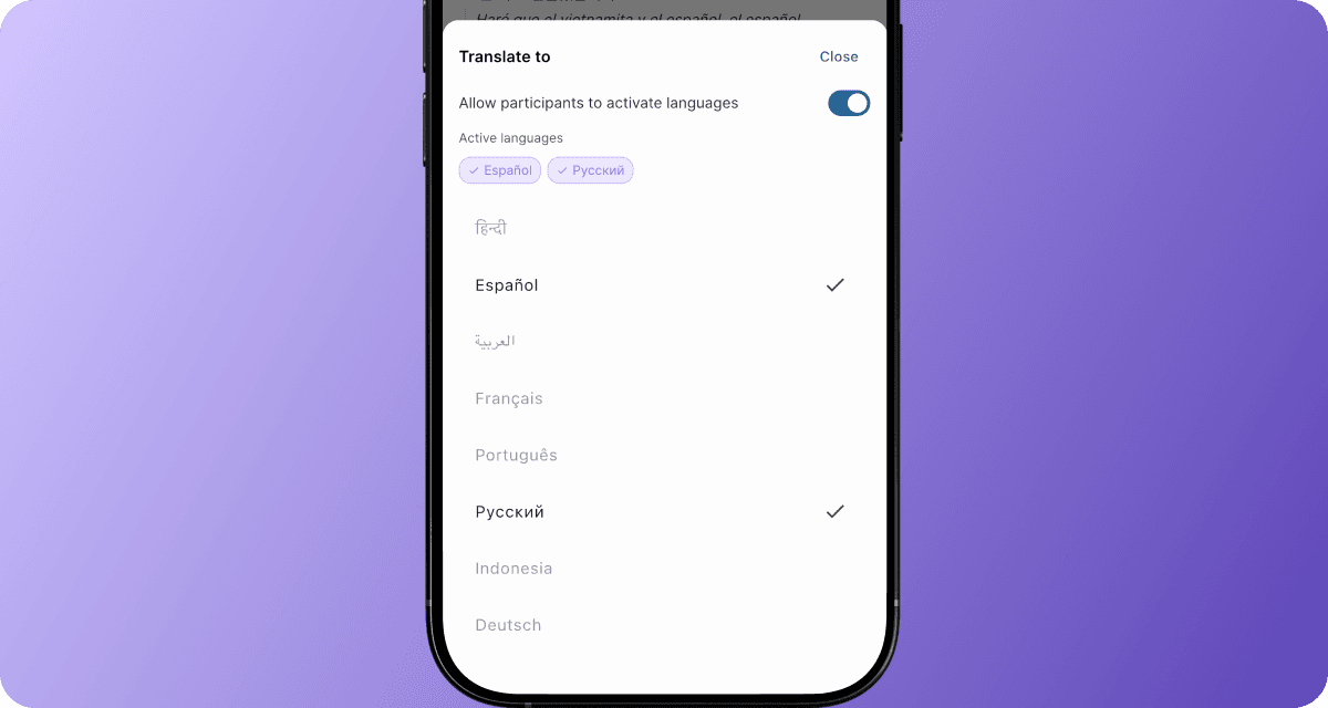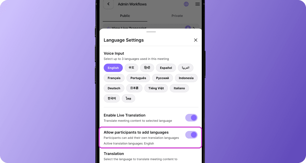 Now when the host enables “Allow Translation”, each attendee can choose their own preferred language and view a live translated script directly on any device (phone, desktop).