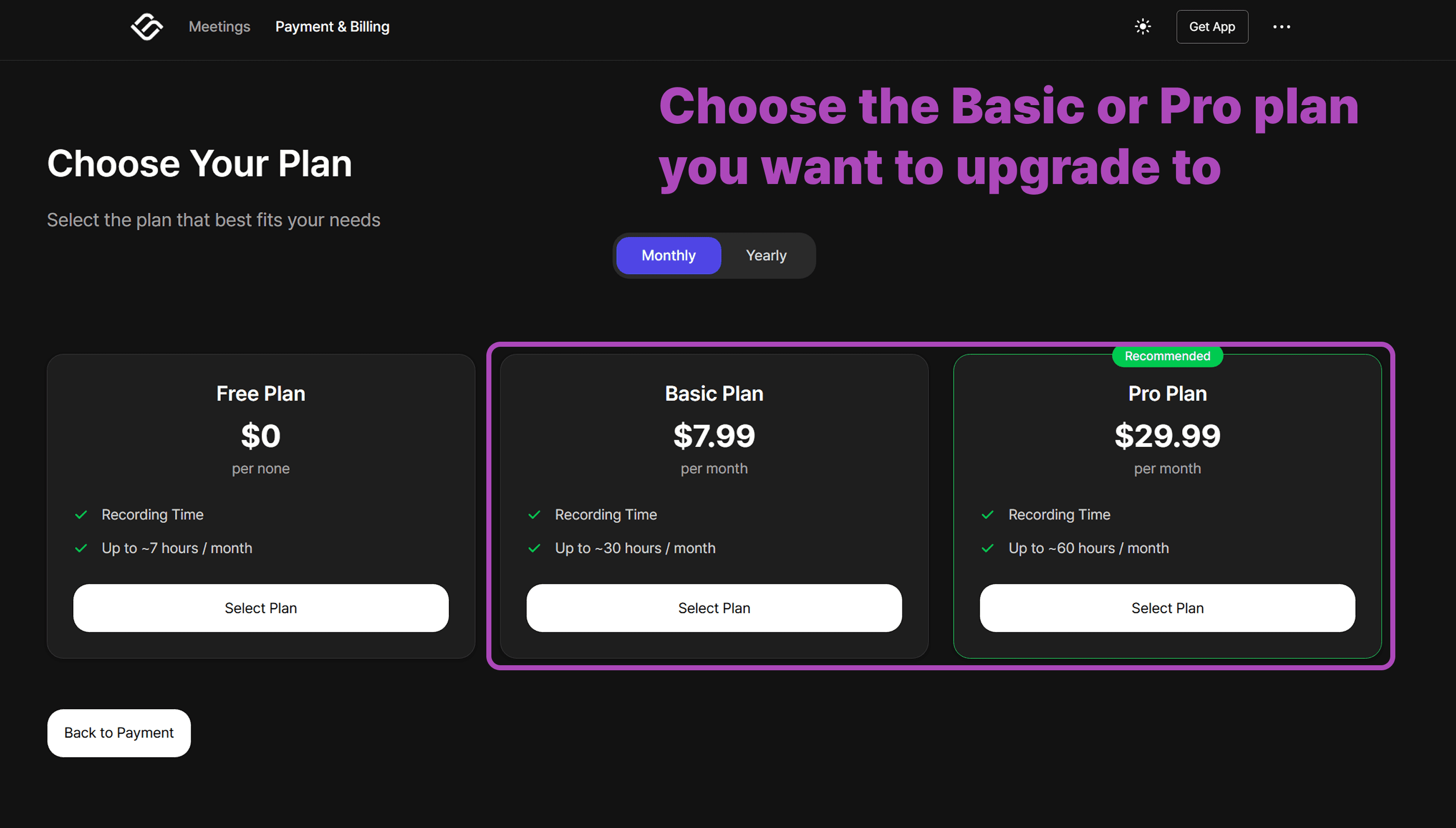 Once you’re in, head to the Payment & Billing section. This is where you can view your current plan and manage upgrades.