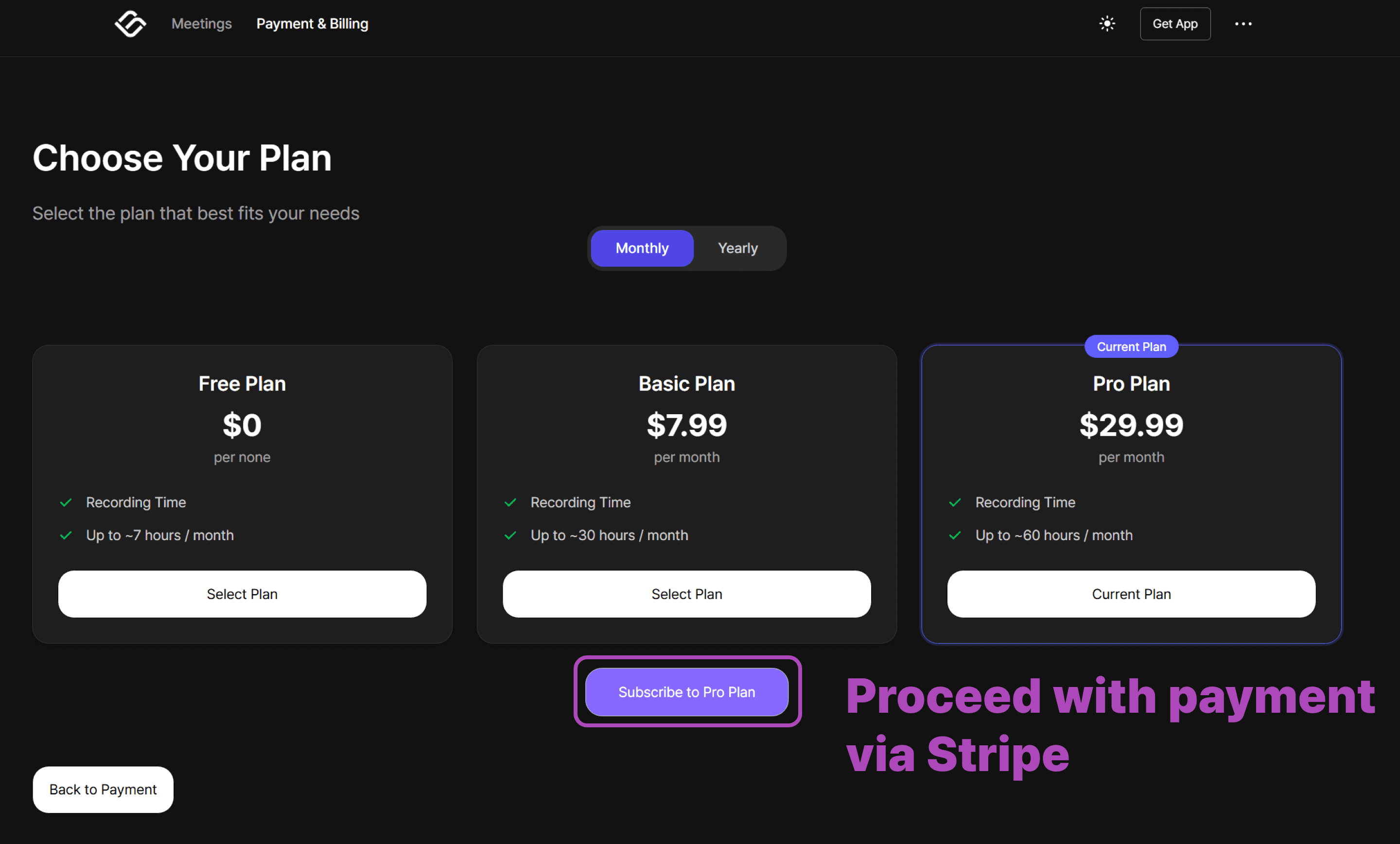 When you select a paid plan, you’ll be redirected to a secure Stripe payment page. Follow the steps to enter your billing details and finalize your subscription.