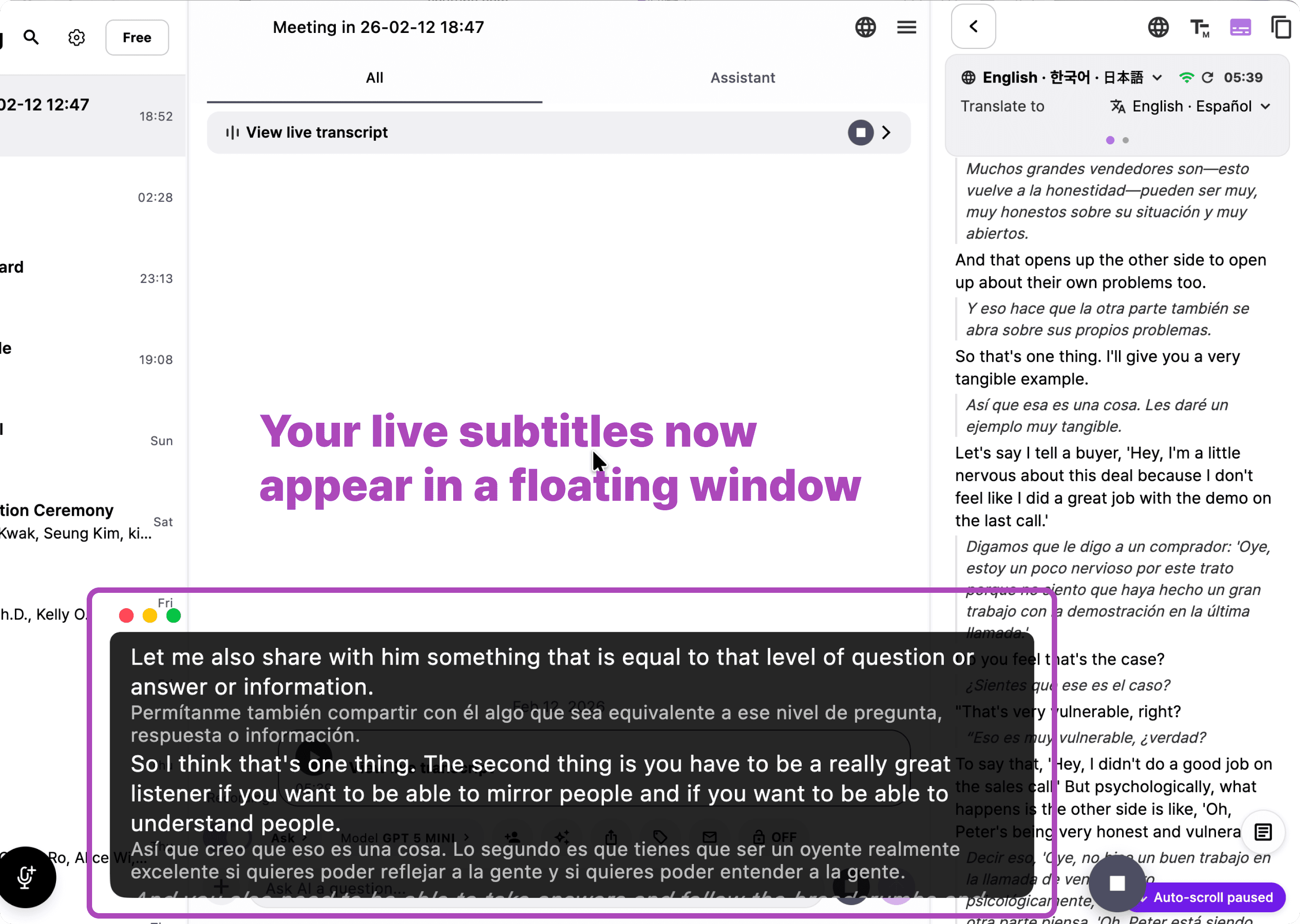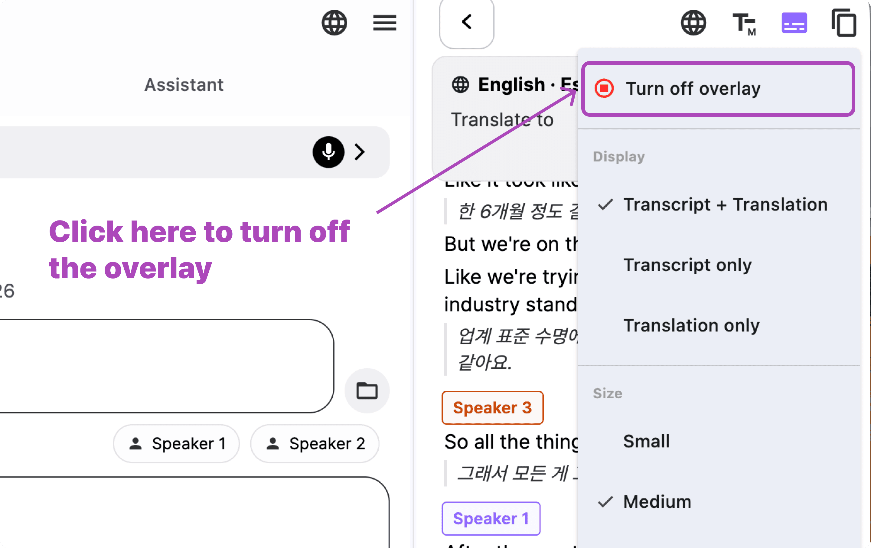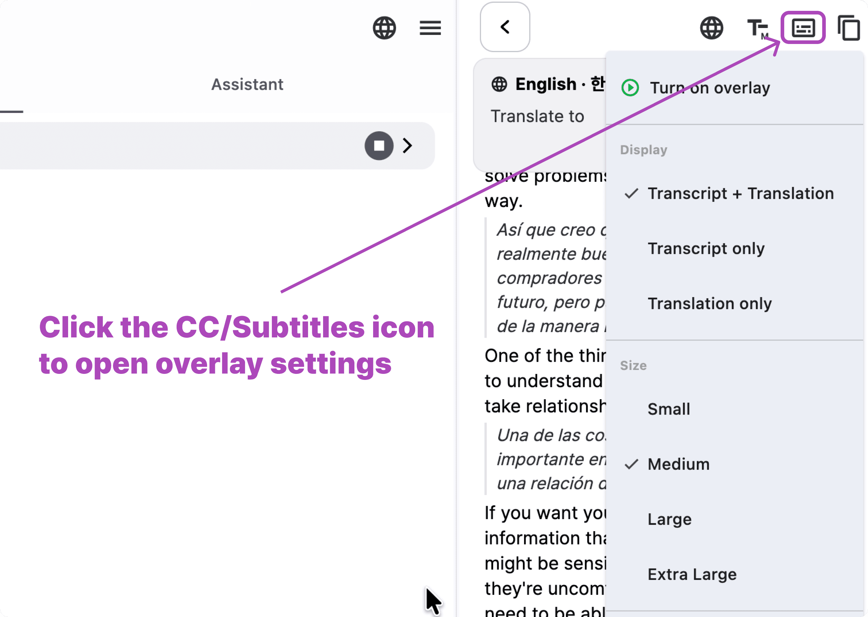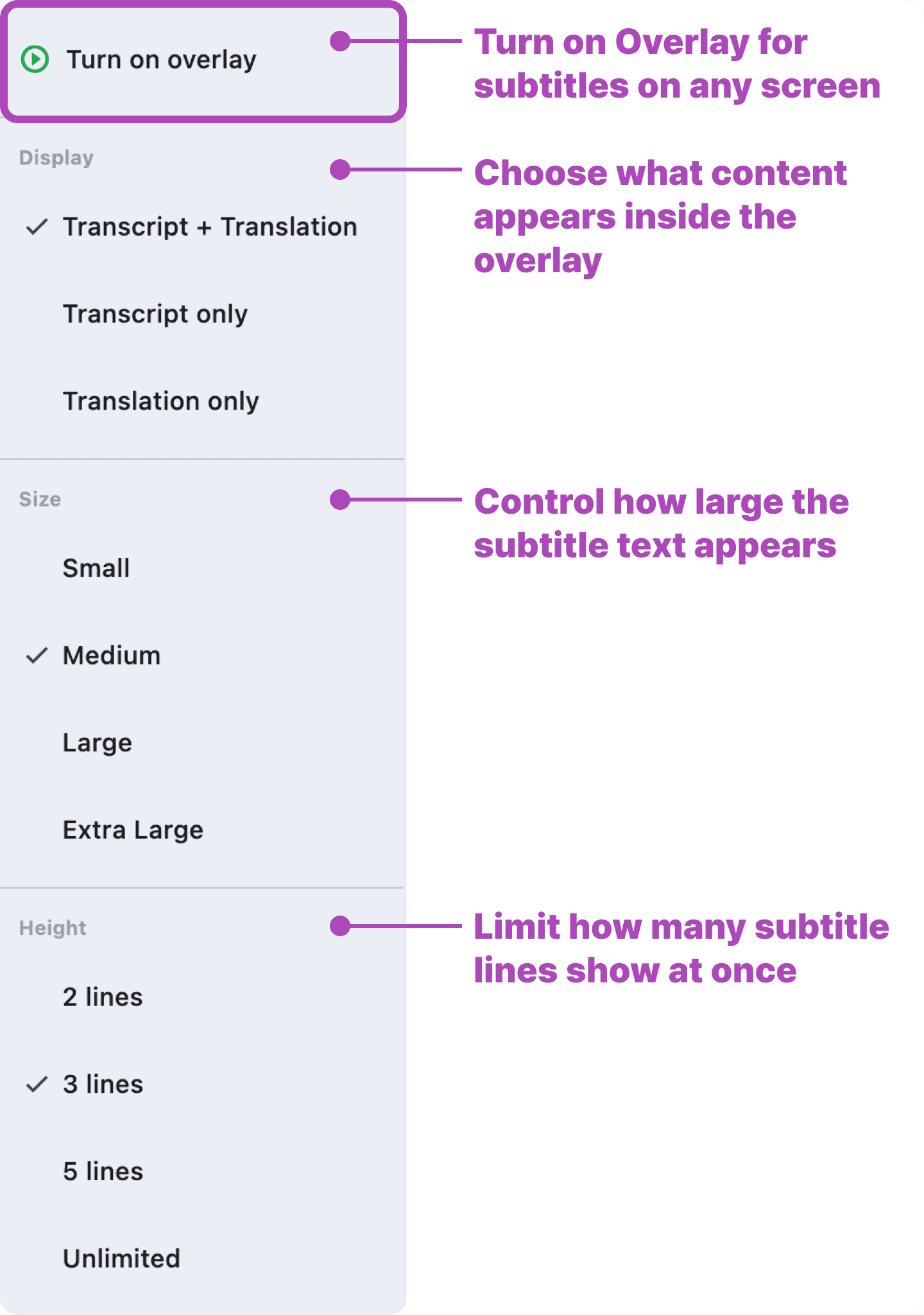 Once you enable overlay mode, subtitles appear instantly in a floating window.