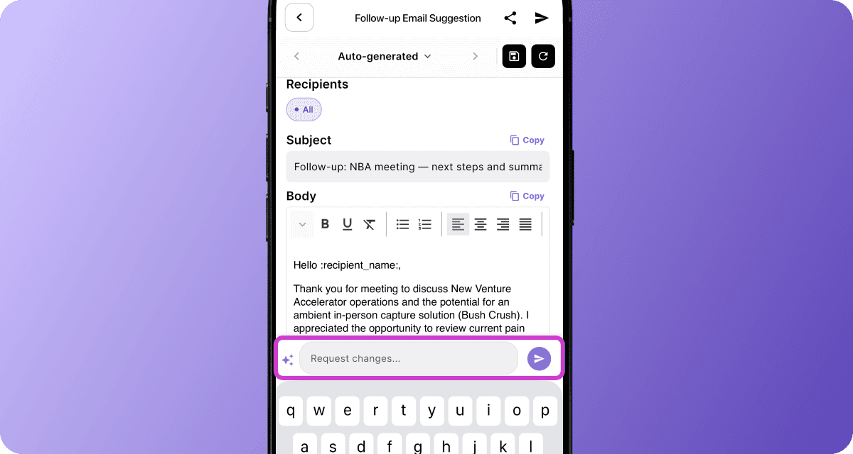 Click Request Changes to instantly regenerate a revised email based on your instructions (e.g., adjust tone, add context, rewrite sections)