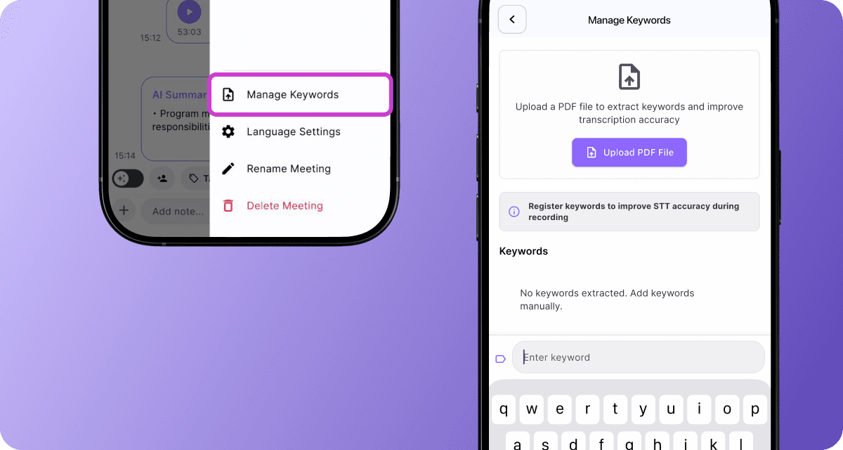 Go to Manage Keywords in the side menu to enter terms directly or Upload a PDF to extract keywords.